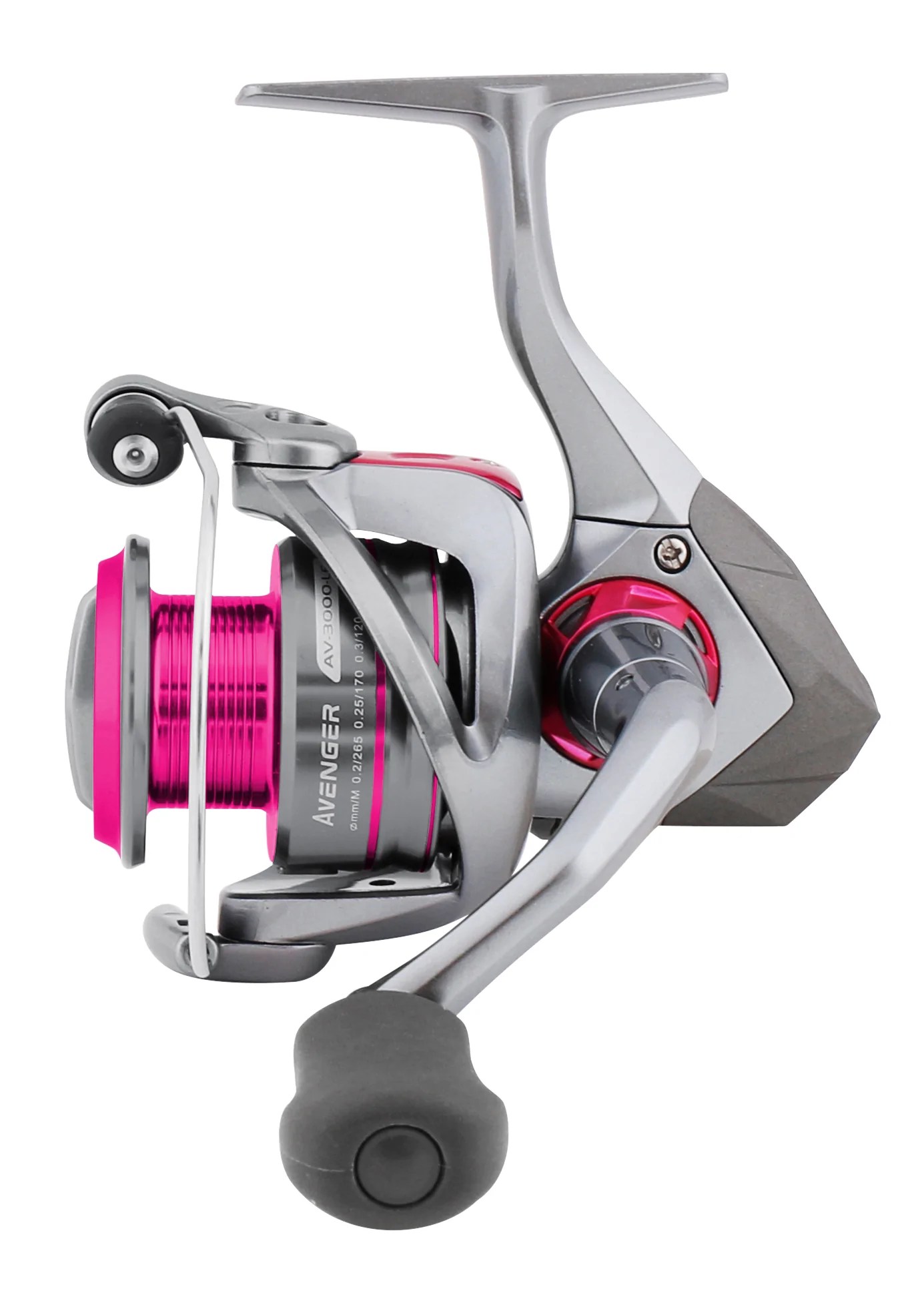 The Avenger spinning reels feature 7 total ball bearings for the ultimate in smoothness and feature up to 22lbs of drag pressure out of the multi-disc, Japanese oiled felt drag system.  The corrosion resistant frame, rotor and handle arm keep the reel lightweight but sturdy, as well as the two toned, machined aluminum spool.